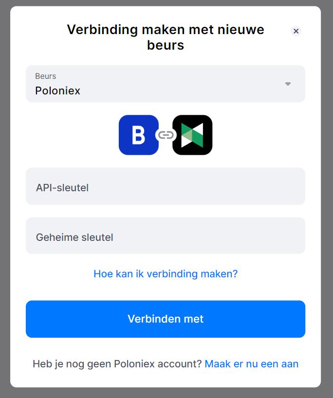 In het pop-up venster moet je Poloniex selecteren. Dit zal een venster openen waar je je API key en Secret key kunt toevoegen. Klik vervolgens op [Verbinden met].