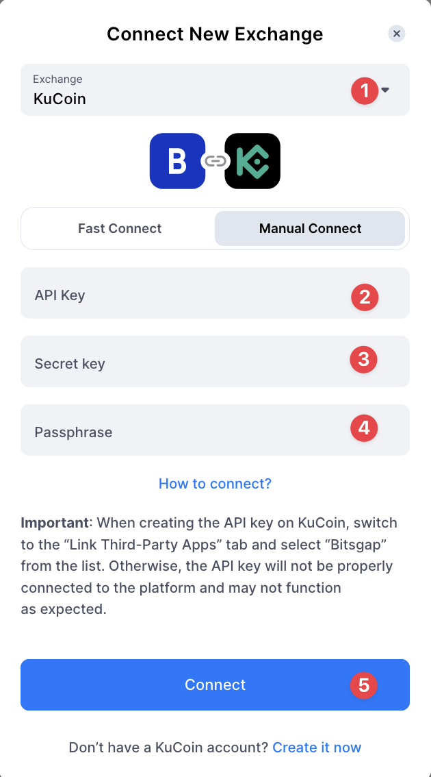 Deze gids geeft stapsgewijze instructies voor het verbinden van je KuCoin-account met het Bitsgap-platform via een API-sleutel. KuCoin biedt twee opties voor API-instelling: KuCoin Fast API en handmatige verbinding. Volg de onderstaande stappen op basis van je voorkeursmethode.
