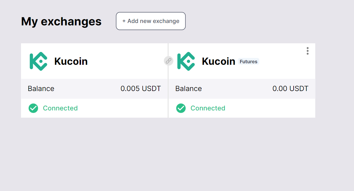 - Controleer of KuCoin wordt vermeld onder Mijn exchanges met de status Verbonden en beschikbaar handelssaldo.