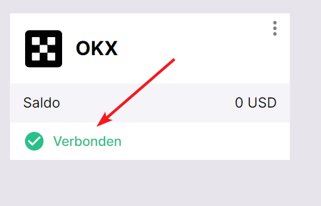 Als je alles juist hebt gedaan, zie je dat OKX is toegevoegd aan de lijst van je verbonden exchanges, met als status Verbonden en een beschikbaar trading saldo in je account.