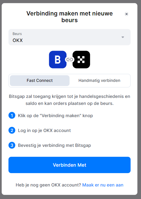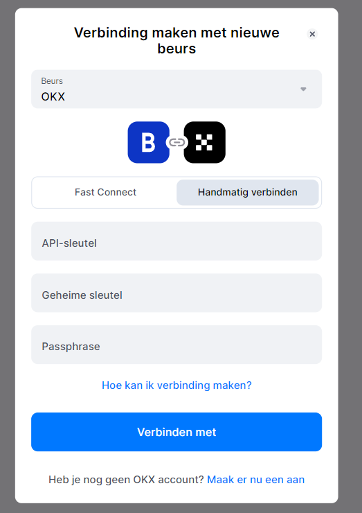 In het pop-up venster selecteer je OKX. In het Handmatig verbinden venster voer je je API key, Secret key, en Passphrase in. Klik vervolgens op [Verbinden met].