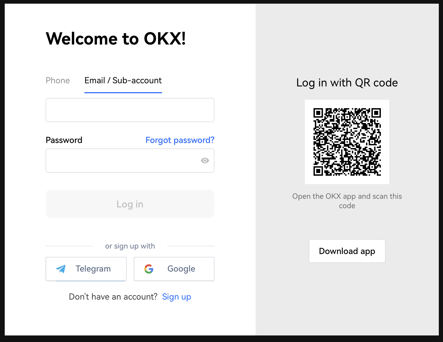 Om je OKX account te verbinden met Bitsgap, voer je OKX accountgegevens in en klik op de [Log in] knop.