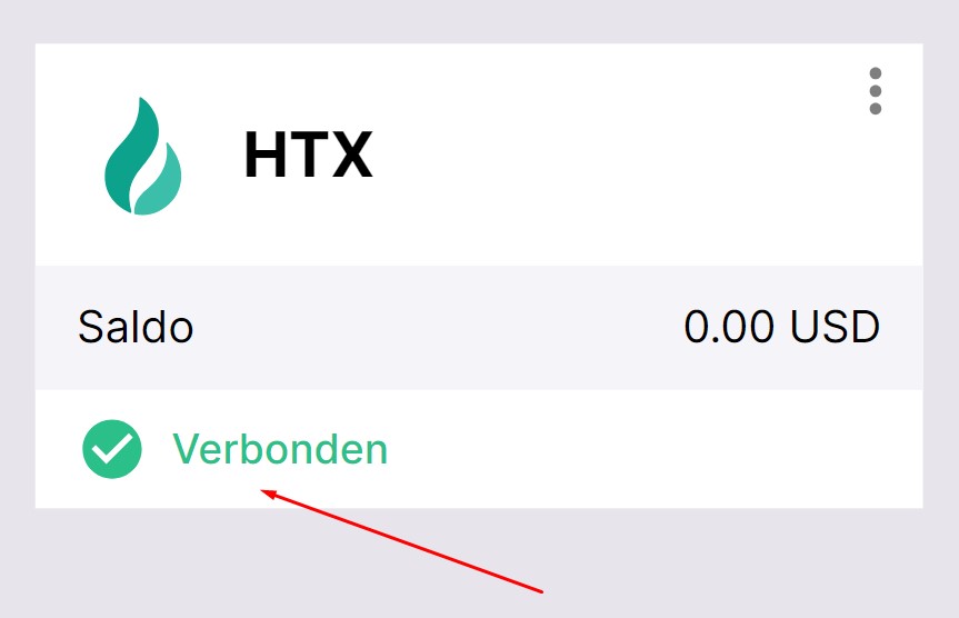 Als je alles juist hebt gedaan, zie je dat HTX is toegevoegd aan de lijst van je verbonden exchanges, met als status Verbonden en een beschikbaar trading saldo in je account.