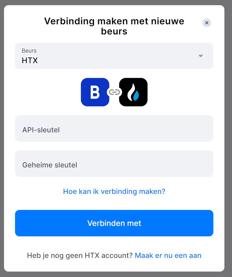 In het pop-up venster selecteer je HTX. Dit zal een venster openen waar je je API key en Secret key kan invullen. Klik daarna op [Verbinden met].