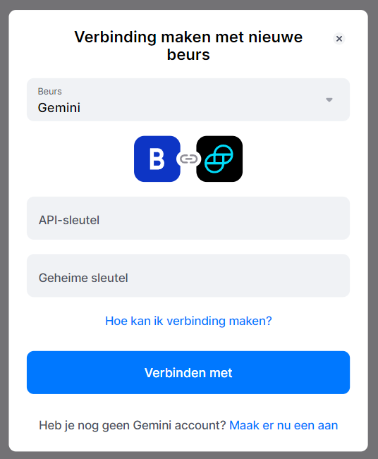 In het pop-up venster selecteer je Gemini. Dit zal een venster openen waar je je Gemini API key en Secret key kan invullen. Klik daarna op [Verbinden met].