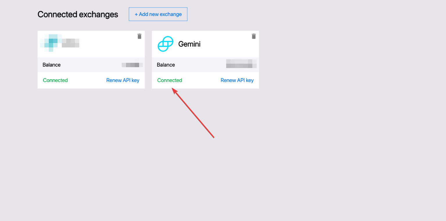 Als je alles juist hebt gedaan, zie je dat Gemini is toegevoegd aan de lijst van je verbonden exchanges, met als status Verbonden en een beschikbaar trading saldo in je account.