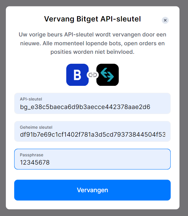 Voer je API-sleutel, geheime sleutel en wachtwoordzin in. Ga verder met het vervangen van de API-key door op de knop [Vervangen] te klikken om je API-key instellingen bij te werken.
