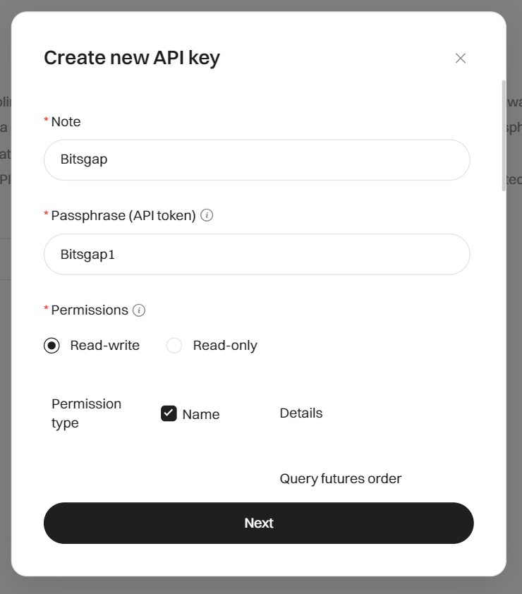 Geef je API-sleutel een willekeurige naam, zodat je gemakkelijk kunt zien dat deze sleutel is gekoppeld aan je Bitsgap-account.