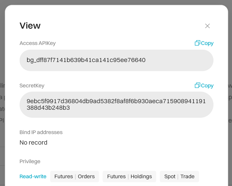 Je Bitget trading key is nu succesvol aangemaakt en klaar om verbonden te worden met ons platform! Kopieer je API-sleutel (API key) en Geheime sleutel (Secret key) op een veilige plek voordat je ze toevoegt aan Bitsgap.