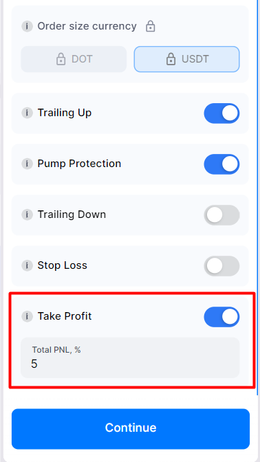 O recurso Take Profit ajuda você a garantir os retornos ao parar o bot e executar ações específicas assim que sua meta de lucro for atingida: