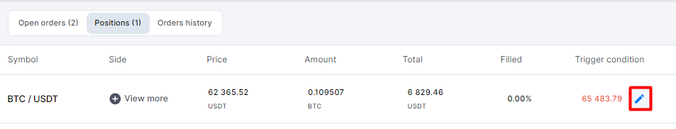 Se quiser alterar os parâmetros de uma ordem inteligente ativa, selecione a ordem e clique no ícone de edição. Na interface de edição, você poderá modificar alguns parâmetros.
