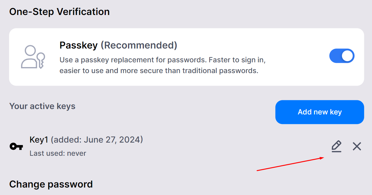 - Acesse a seção Suas chaves ativas na web ou a seção Passkey no aplicativo.