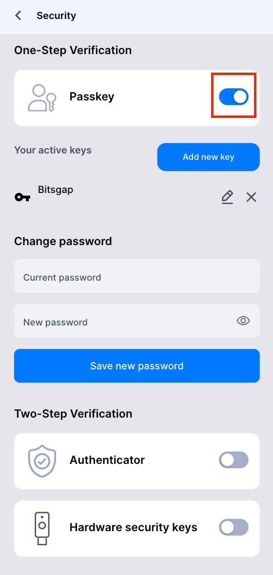 Navegue para Configurações → Segurança → Passkey no aplicativo. -