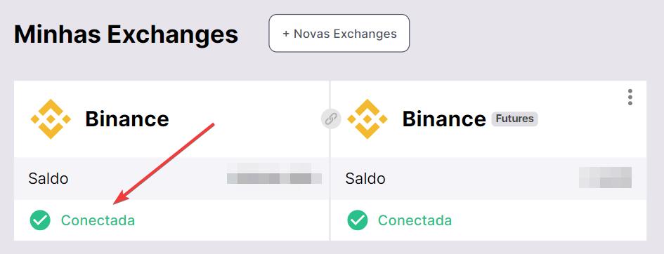 Se tudo for feito corretamente, você verá a Binance adicionada à lista de suas exchanges conectadas com o status Conectada e o saldo de negociação disponível em sua conta.