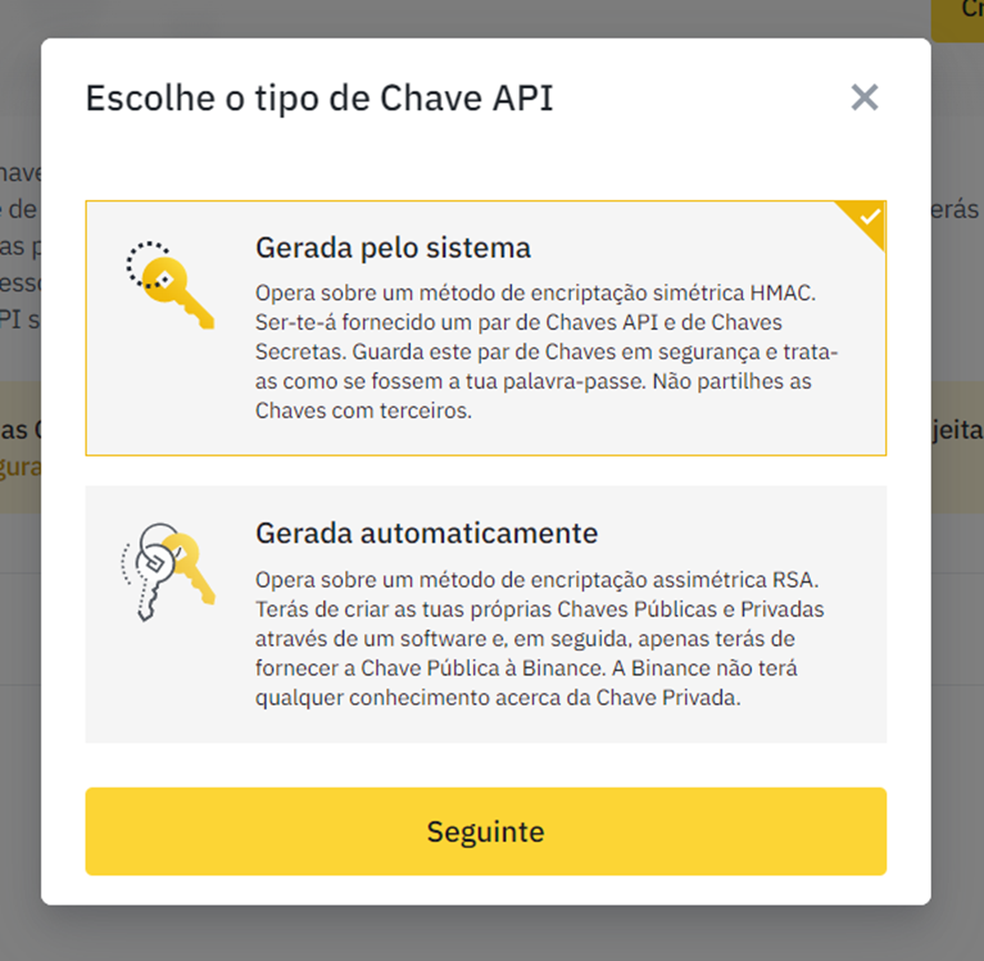 Atualmente, existem duas opções para criar chaves API na Binance: