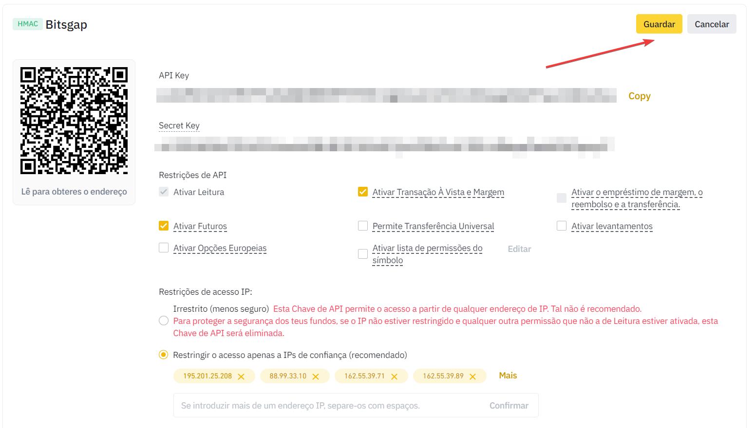 - Restrições de acesso IP: Restringir o acesso apenas a IPs de confiança (insira os IPs copiados da guia Minhas Exchanges).