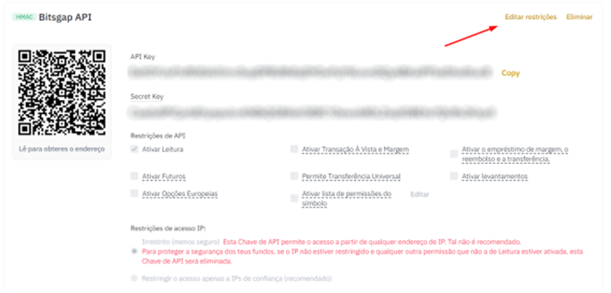 Agora você precisa editar as restrições da sua chave API - isso permitirá que nossa plataforma processe sua atividade de negociação em sua conta dBinance. Clique em [Editar restrições] como mostrado acima e siga as instruções adicionais.
