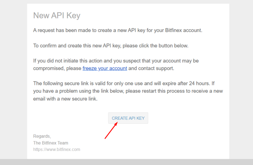 Na sua caixa de entrada de e-mail, você encontrará um e-mail da Bitfinex. Abra-o e clique no botão [Create API key].