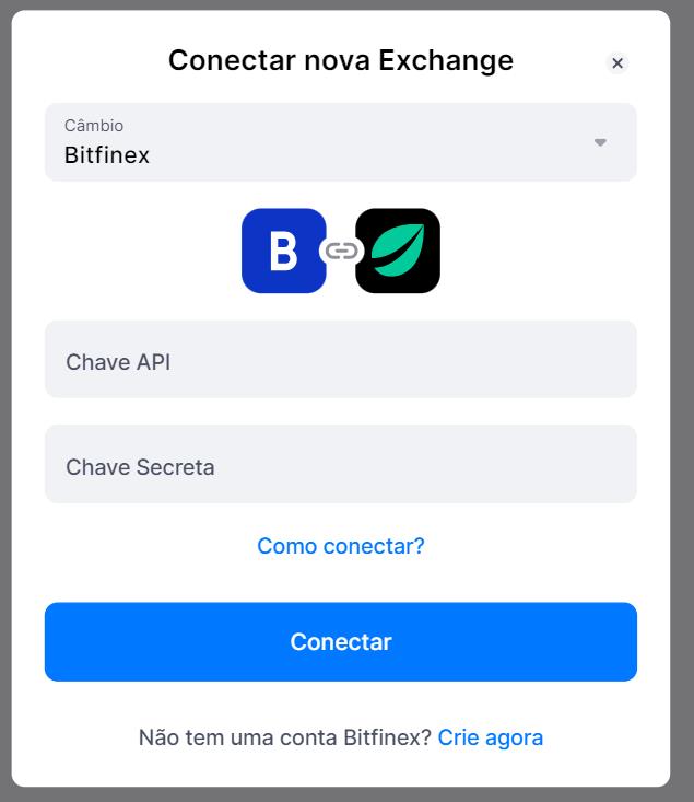 Na janela que aparecer, você precisa selecionar Bitfinex. Isso abrirá uma janela onde você pode adicionar sua Chave API e Chave Secreta e, em seguida, clique em [Conectar].