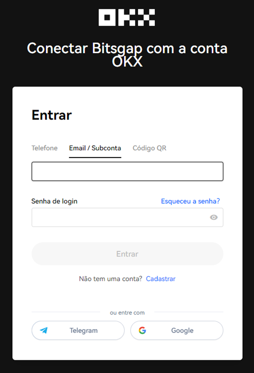 Para conectar sua conta OKX à Bitsgap, insira as credenciais da sua conta OKX e clique no botão [Entrar].