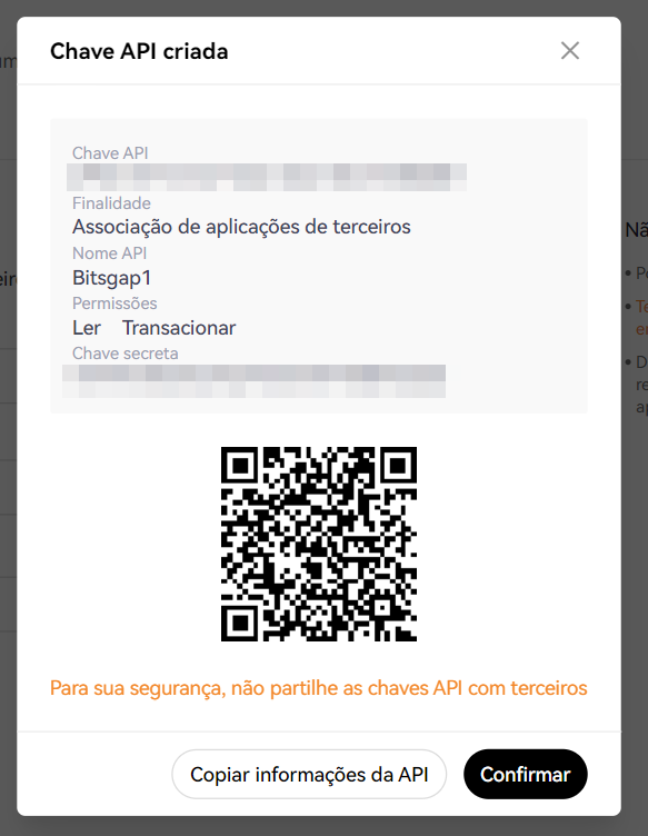 Sua chave de negociação da OKX foi criada com sucesso e está pronta para ser conectada à nossa plataforma! Copie sua Chave API e Chave Secreta em algum lugar seguro antes de adicioná-las à Bitsgap.