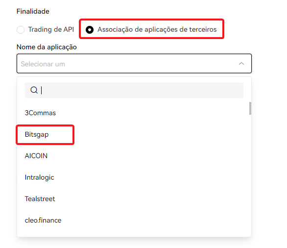 Para criar uma chave API para a Bitsgap, clique no botão [Associação de aplicações de terceiros] na seção Finalidade e escolha Bitsgap na lista Nome da aplicação.