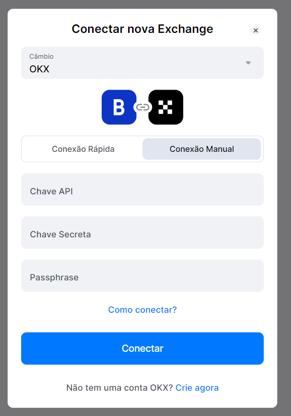 Na janela que aparecer, você precisa selecionar OKX. Na janela Conexão Manual, você pode colar sua Chave API, Chave Secreta e Frase de acesso. Em seguida, clique em [Conectar].