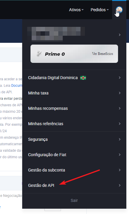 Nas configurações da sua conta (canto superior direito), navegue até a página Gestão de API.