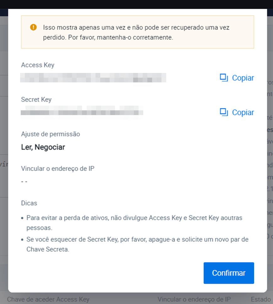 5. Copie sua Chave API e Chave Secreta
