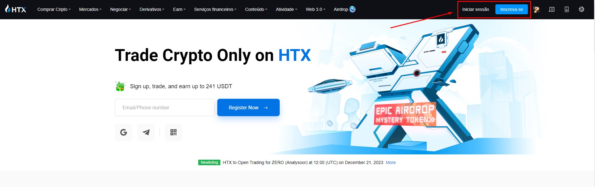 Faça login na sua conta HTX ou crie uma nova.