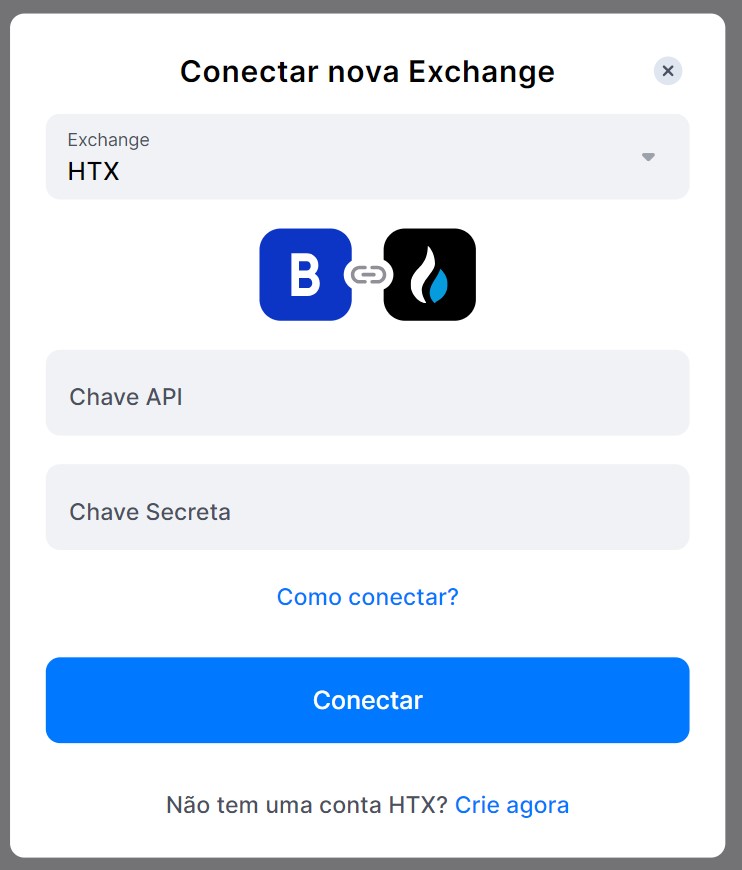 Na janela que aparecer, você precisa selecionar HTX. Isso abrirá uma janela onde você pode adicionar sua Chave API e Chave Secreta e, em seguida, clique em [Conectar].