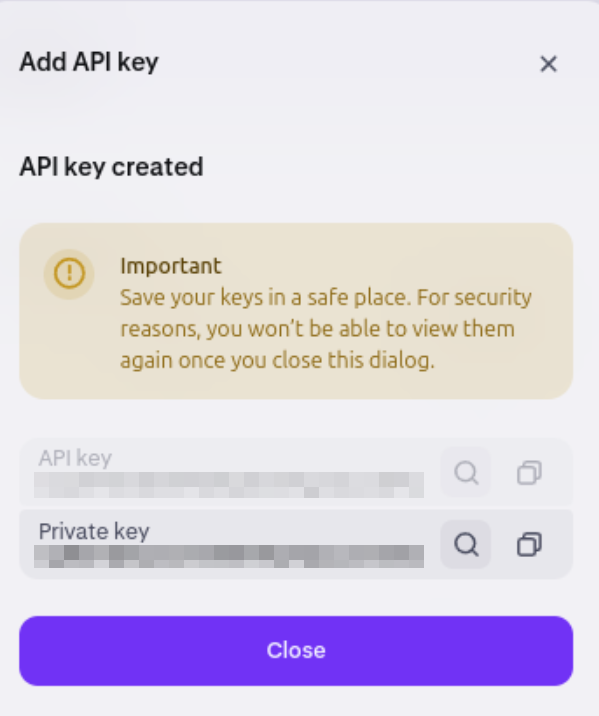 O Kraken irá gerar uma Public (API) Key e uma Private (Secret) Key. Copie ambas as chaves e armazene-as com segurança. Elas serão necessárias para a conexão com o Bitsgap.