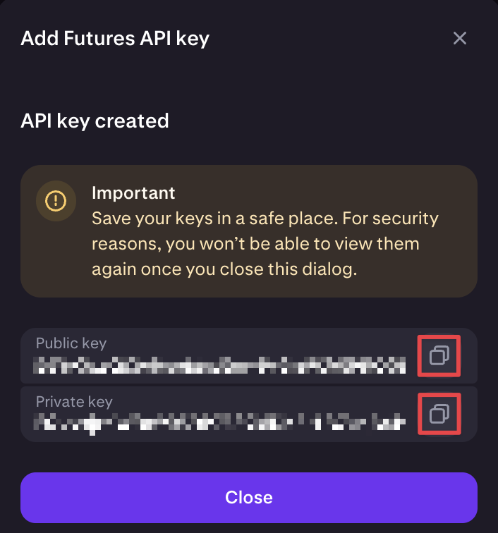 Armazene-as com segurança, pois você precisará delas para conectar ao Bitsgap.