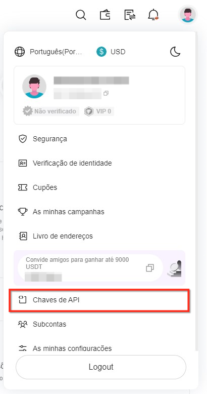 No perfil da sua conta, navegue até a página "Chaves de API".
