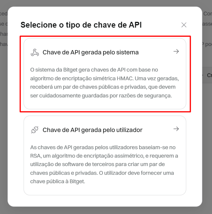 Selecione “Chave de API gerada pelo sistema” e prossiga com a criação da sua chave clicando na seta.