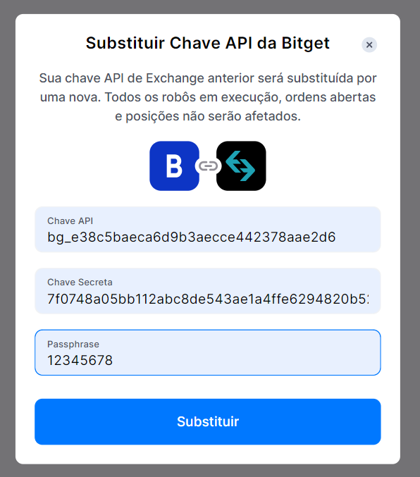 Insira sua chave API, Chave Secreta e sua Senha. Prossiga para renovar a chave API clicando no botão [Substituir] para atualizar as configurações da chave API.