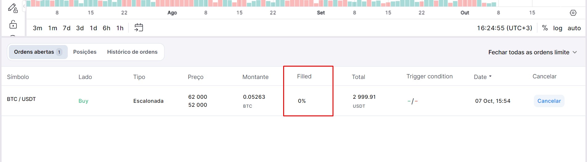 Para verificar se sua ordem foi executada, acesse a aba Ordens abertas. O volume preenchido aparecerá à medida que as ordens limite forem executadas.