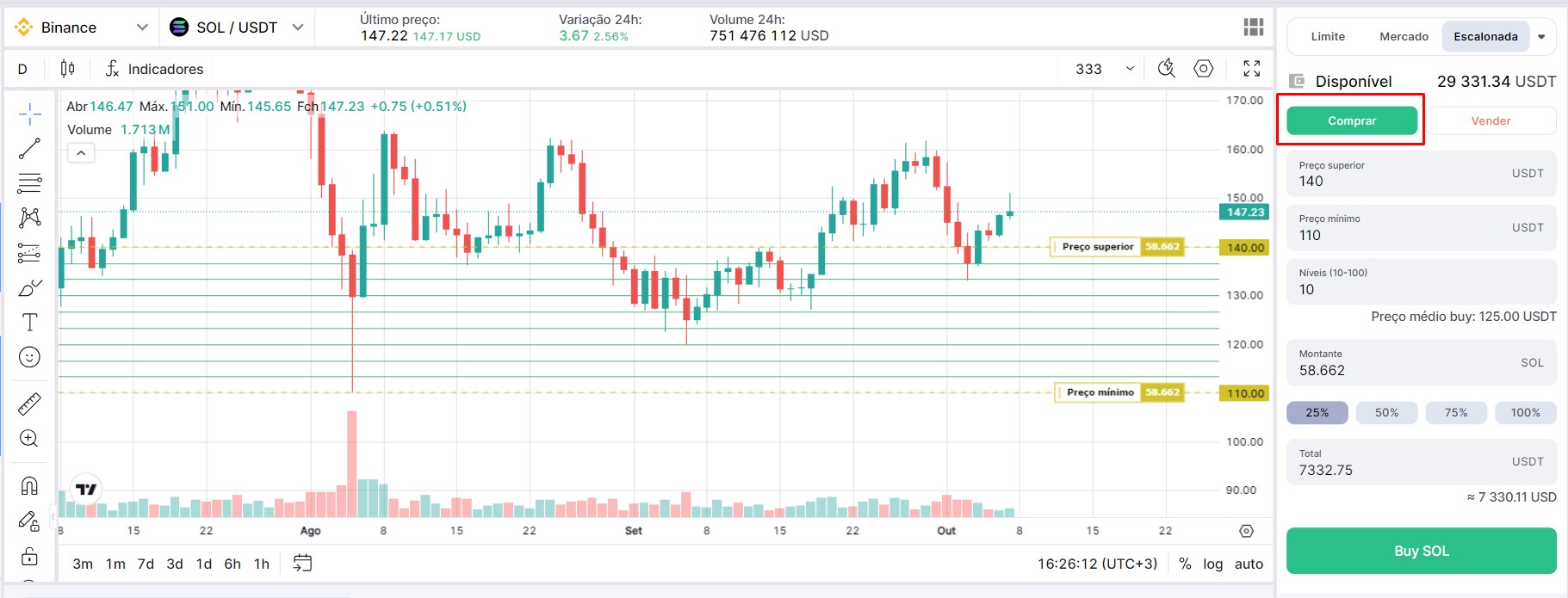 Ao iniciar uma ordem escalonada, a ordem de compra só pode ser colocada abaixo do preço atual. Isso significa que a ordem escalonada de venda só pode ser colocada acima do preço atual. Depois que todos os parâmetros forem configurados, clique em [Comprar/Vender...].