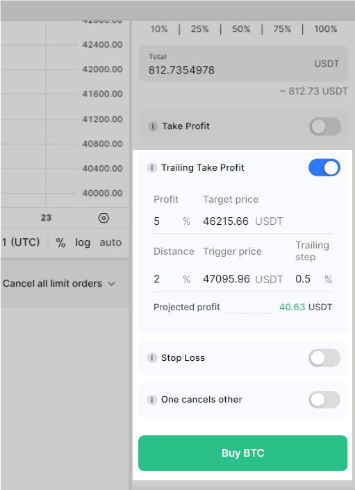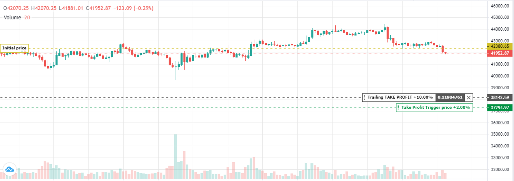 Depois disso, o Trailing Take Profit seguirá o preço para cima e executará o pedido de venda quando ocorrer uma correção do preço. Essa configuração permite que você compre a moeda pelo melhor preço possível quando o rali começar e a venda no topo quando o preço começar a cair.