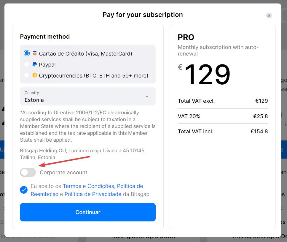 Se você for uma empresa europeia, o Bitsgap permite que você faça pagamentos isentos de IVA para qualquer plano de assinatura através da sua conta corporativa. Veja como você pode adquirir um plano utilizando sua conta empresarial.
