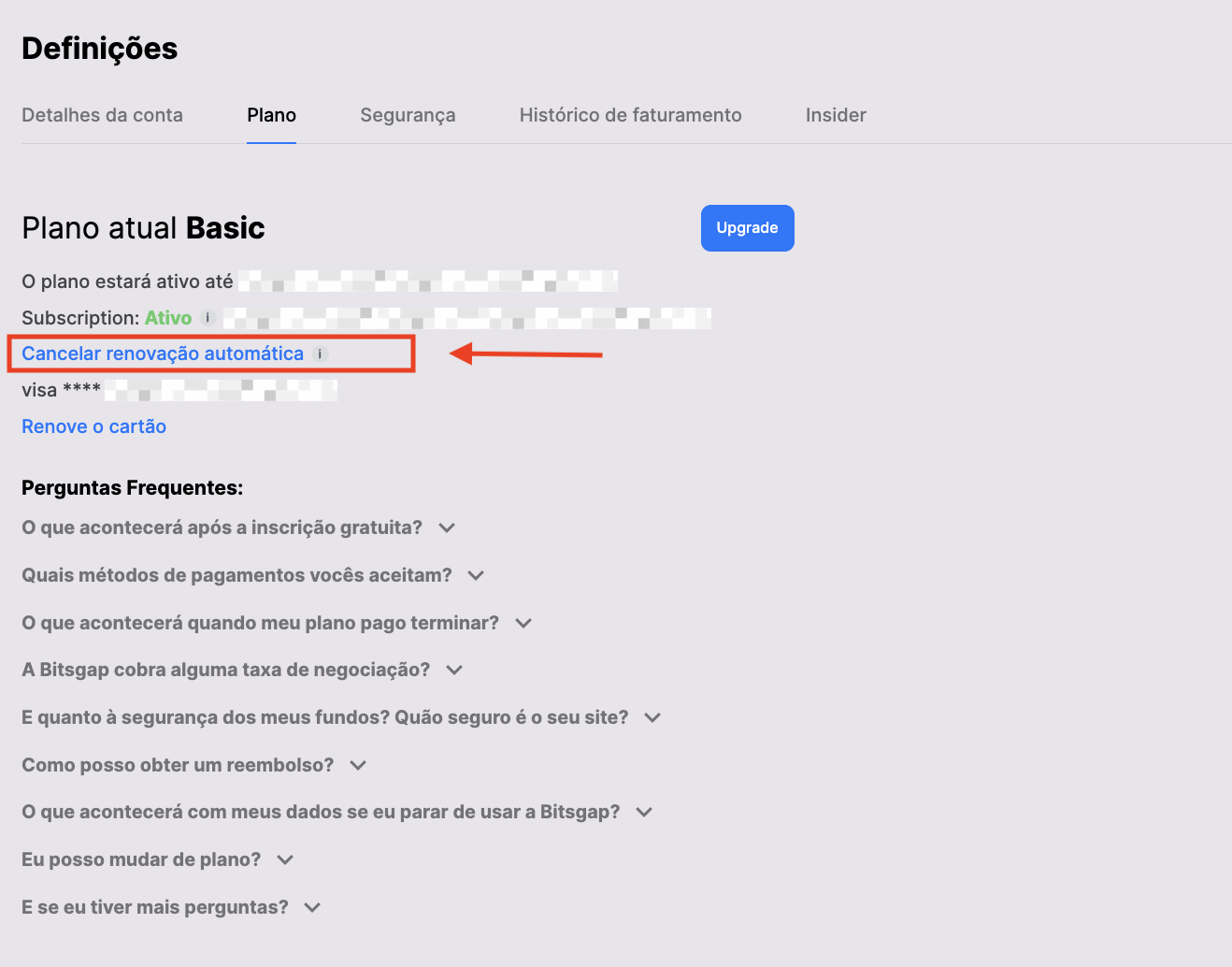 Você pode cancelar o renovação automática clicando no botão [Cancelar renovação automática da assinatura]. Isso interromperá os pagamentos futuros, mas não afetará seus bots ou ordens ativas. Saiba mais sobre renovação automática neste artigo.