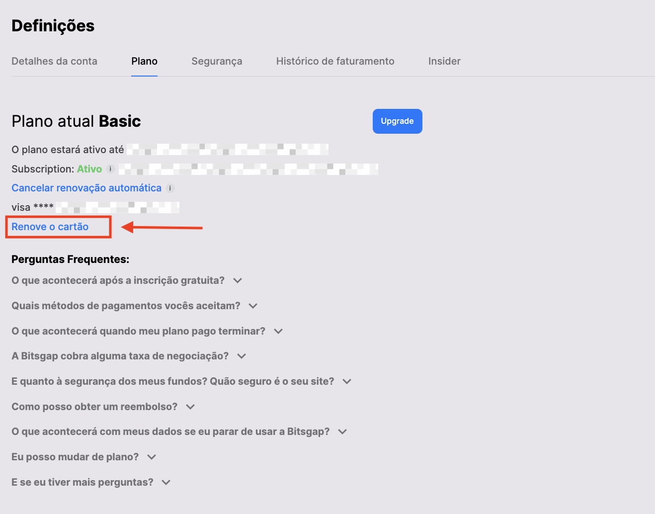 Para atualizar os detalhes do seu cartão de pagamento, clique no botão [Renovar um cartão].