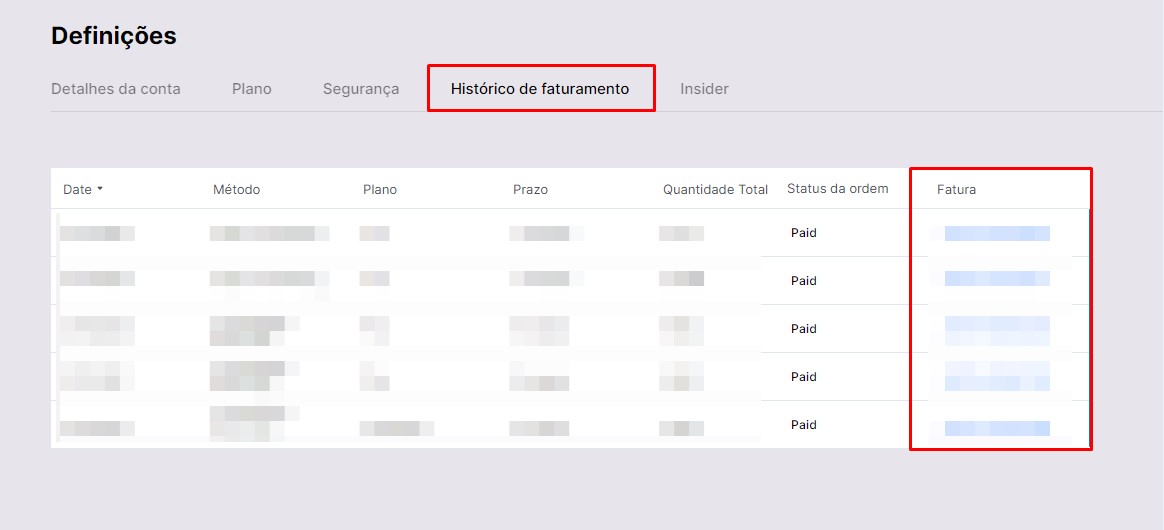 Visualize e baixe suas faturas navegando até a página Configurações > Histórico de Faturamento.