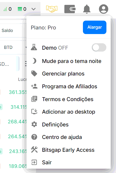 Inicie sessão na sua conta Bitsgap e clique no botão do seu perfil. Pressione [Alargar] ou [Melhorar] ao lado das informações do seu plano.