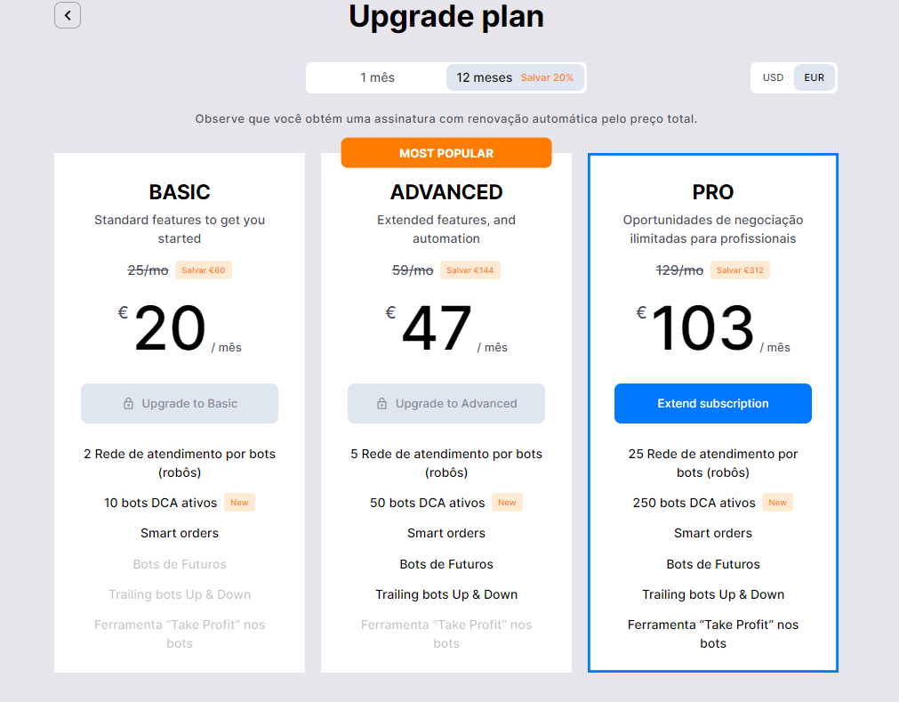 Atualizando sua assinatura: Desbloqueie recursos avançados e melhore sua experiência de negociação ao atualizar seu plano.