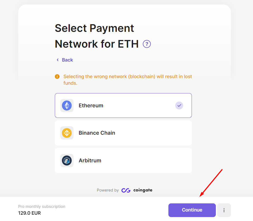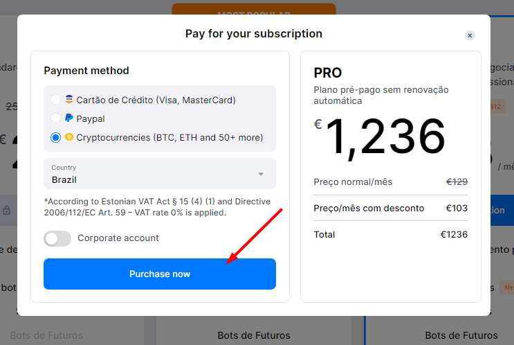 Selecione criptomoedas como seu método de pagamento. Quando estiver pronto, clique em [Purchase now].