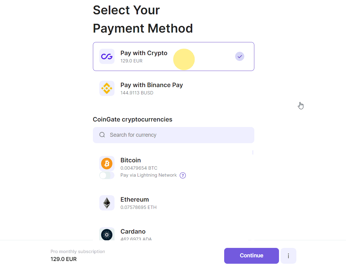 3. Selecione um método de pagamento com criptomoeda