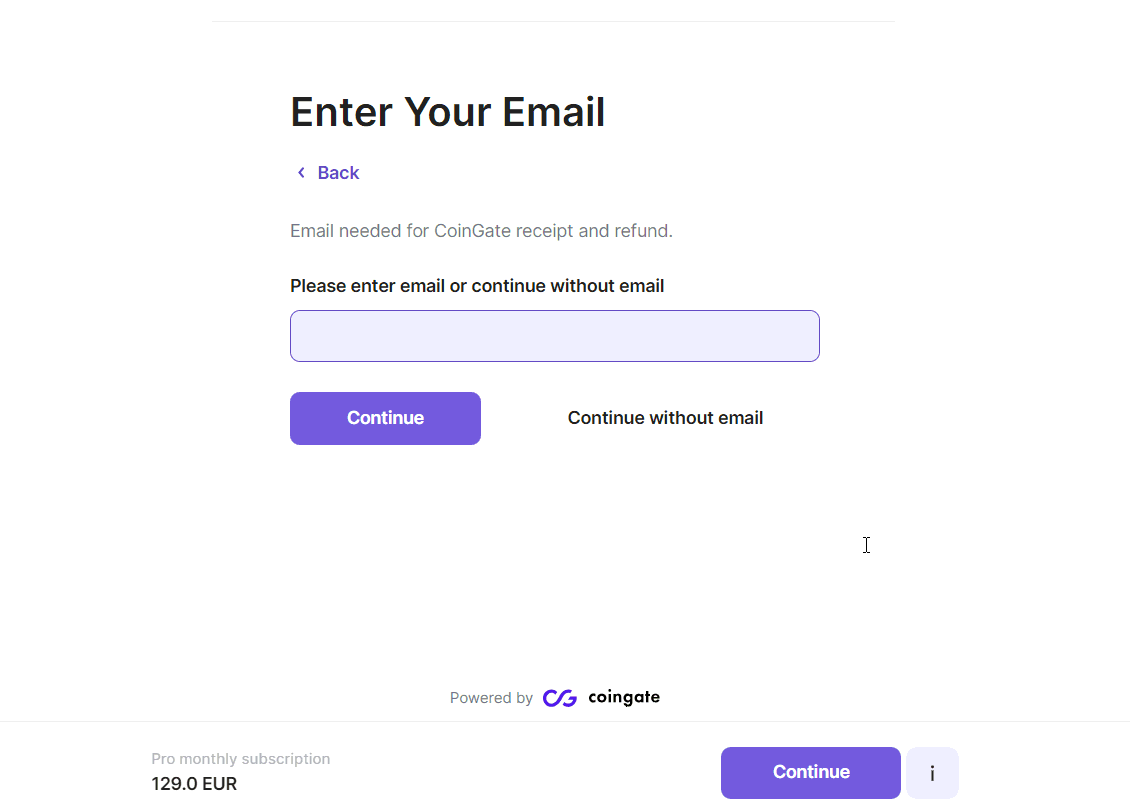 Insira o seu e-mail para confirmar o pagamento e obter um recibo. Quando estiver pronto, prossiga com [Continue].