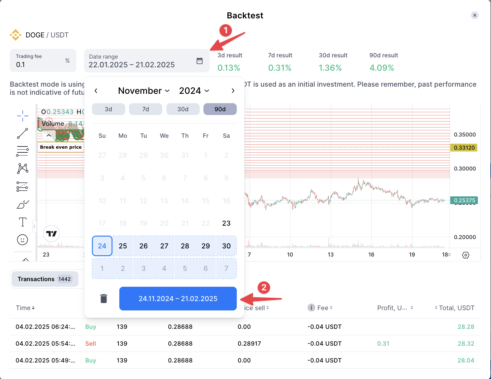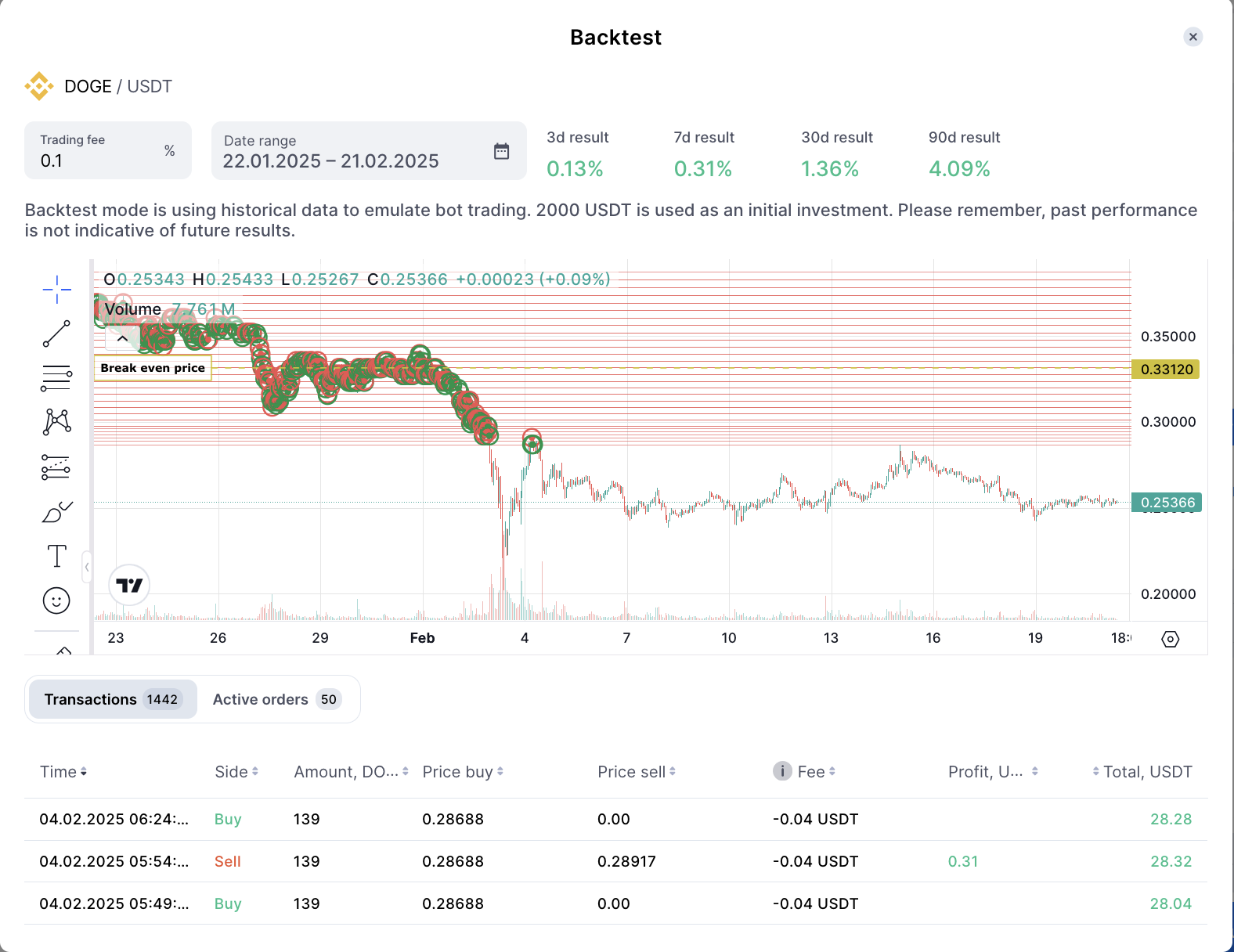 Инструмент Backtest позволяет проанализировать эффективность бота на основе выбранных вами параметров, включая настройки сетки и сумму инвестиций. Благодаря моделированию работы бота на исторических рыночных данных, Backtest помогает оценить возможные результаты до запуска бота.