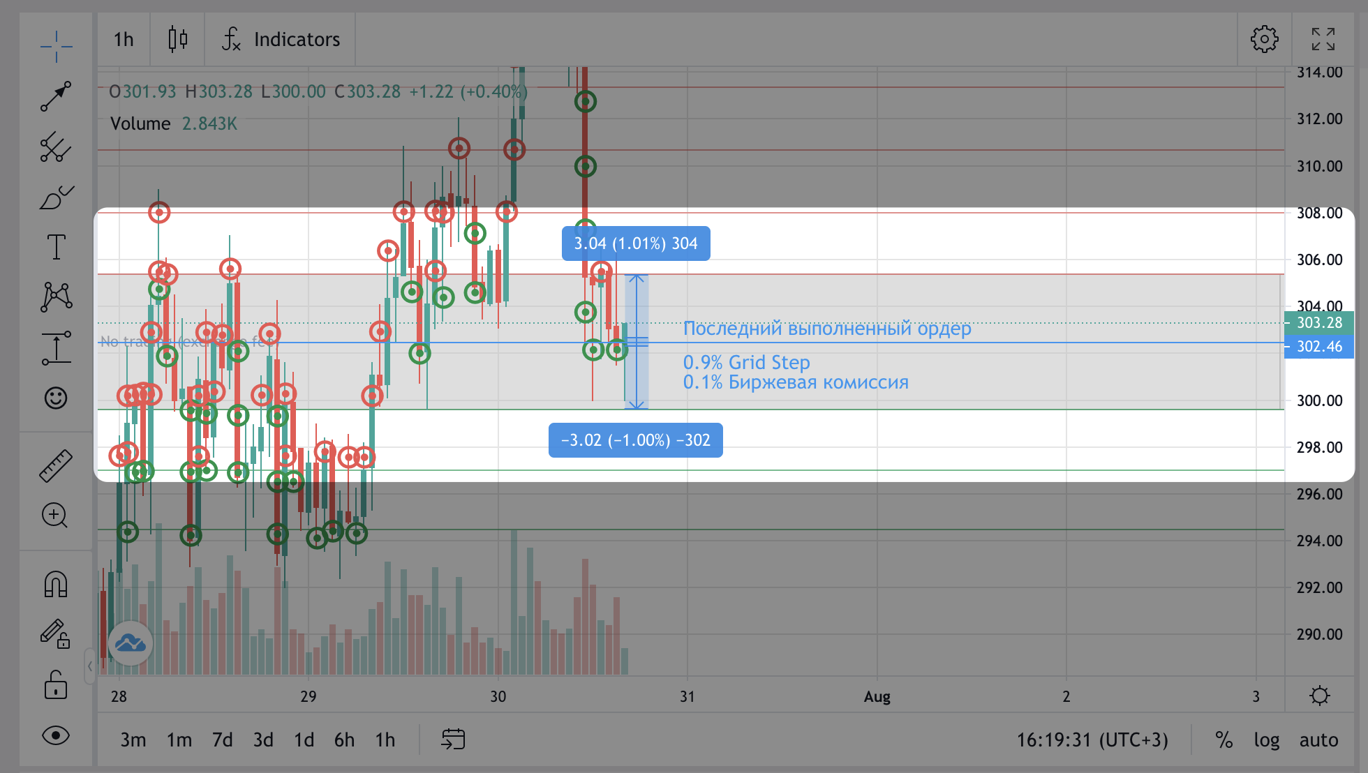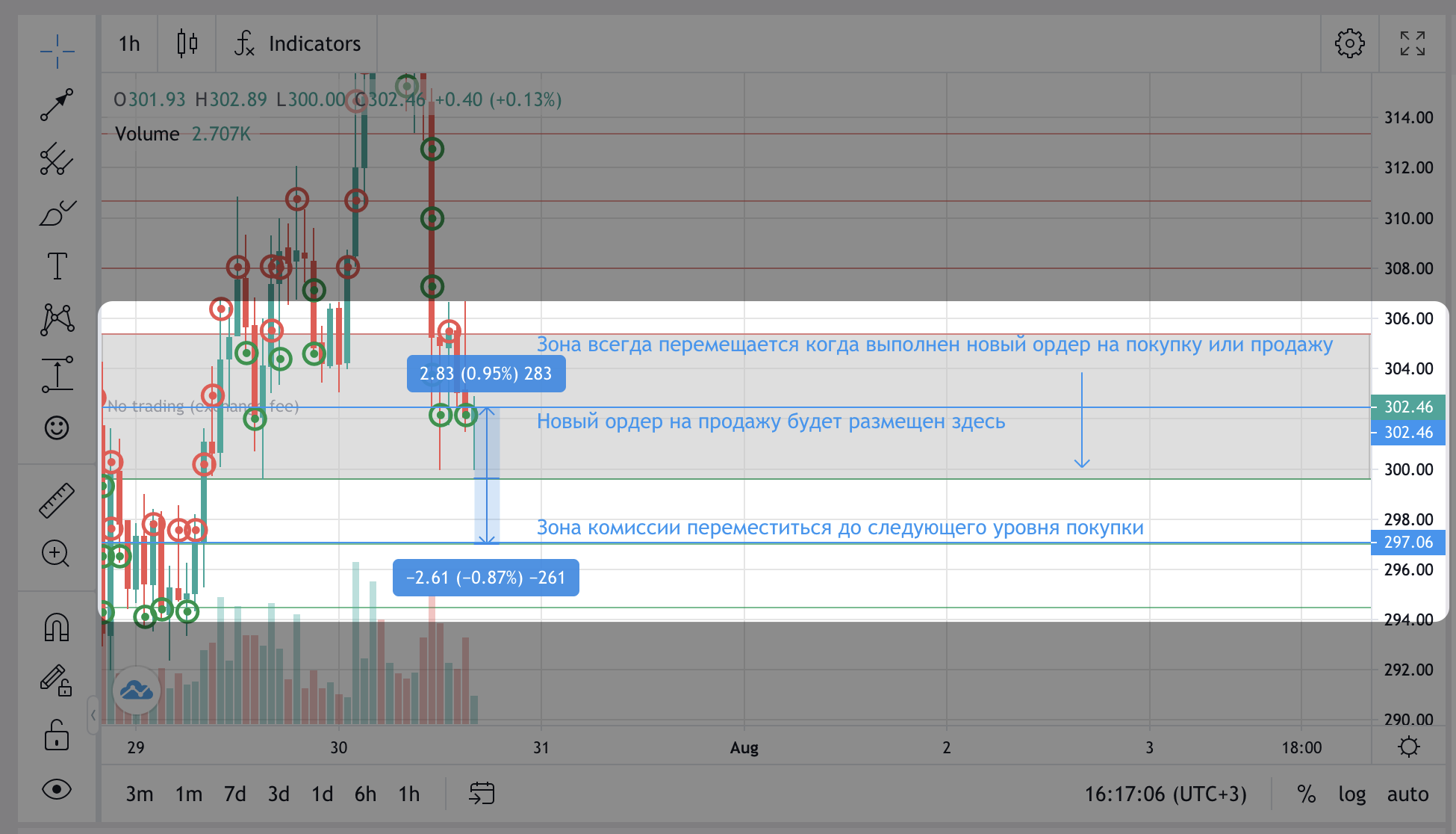 Зона без торговли, также известная как Exchange Fee Zone, — это область на графике, где не размещаются ордера из-за размера шага сетки и комиссии вашей биржи.